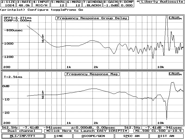 上の図は上半分は群遅延、下半分はQAMのF特です。1k付近のディップとピークはバッフル端反射である事が幾つかのシミュレーションソフトで確認されています。バッフルサイズは30x36(wxh)です。