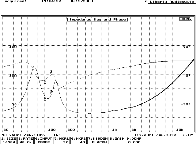 この箱では少しバスレフの負荷が上によっているようでもう少しポートを長くするか、内容積を増すなどしてポートの共振周波数を下げてやりたいところです。もともとFE88ES用でしたのでこれは仕方がないところかも。高域のインピーダンス上昇はL成分がかなりあることを示しています。